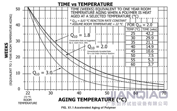大家仔細(xì)分析上述兩個(gè)公式可以發(fā)現(xiàn),決定加速老化時(shí)間的關(guān)鍵因素是加速老化溫度,根據(jù)ASTM F1980-16附錄X1.1,能夠明確無菌屏障系統(tǒng)在選定溫度下的熱老化相當(dāng)于1年的室溫老化的時(shí)間。例如,若確定Q10為2,加速老化溫度選用50℃,則加速老化時(shí)間為7.5周。特別要注意的是,大多數(shù)醫(yī)用聚合物建議的溫度上限是60℃。